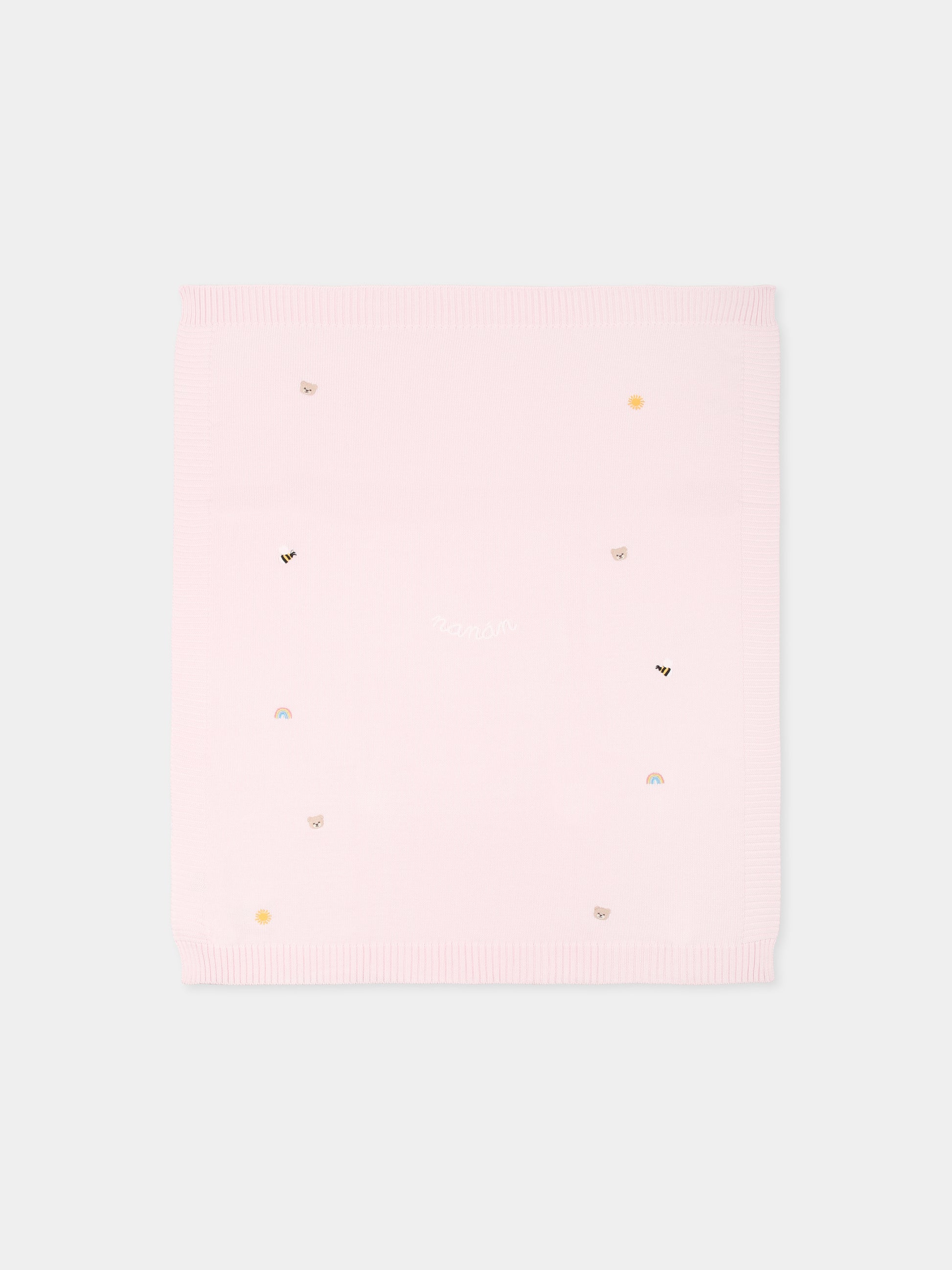 Colore: Rosa Descrizione: Coperta rosa in maglia, con profili a costine; è decorata con api, arcobaleni e logo, ricamati sulla parte anteriore. Dimensioni (L x A): 71cm x78,5cm Dettagli: 100% Cotone organico. Lavare a mano.
