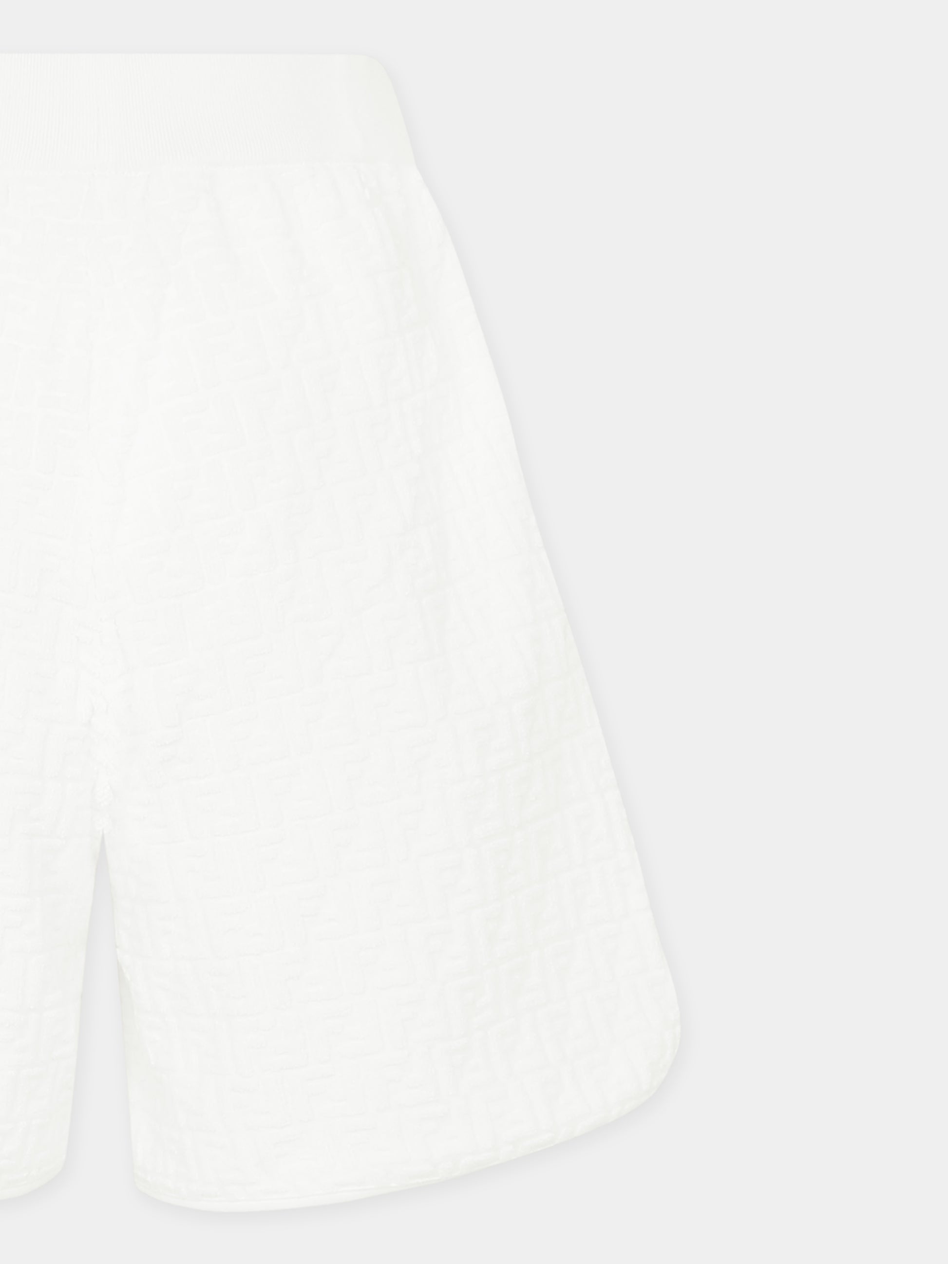 Colore: Bianco Descrizione: Shorts bianchi del luxury brand Fendi Kids, realizzati in misto cotone. Presentano una vita elasticizzata e tacshe laterali. Sono decorati con iconica FF in spugna all-over a rilievo. Made in Italy Dettagli: 87% Cotone, 13% Poliammide. Lavare a 30°C.