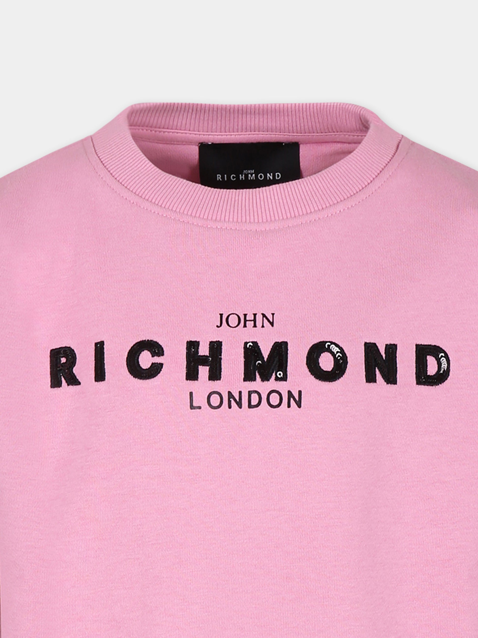 Colore: Rosa Descrizione: Vestito rosa in misto cotone, leggermente felpata, a maniche lunghe, con girocollo e polsini a costine e balza sul fondo. È decorato con logo e paillettes sulla parte anteriore e con logo sul retro. Dettagli: 86% Cotone, 14% Poliestere. Lavare a 30°C.
