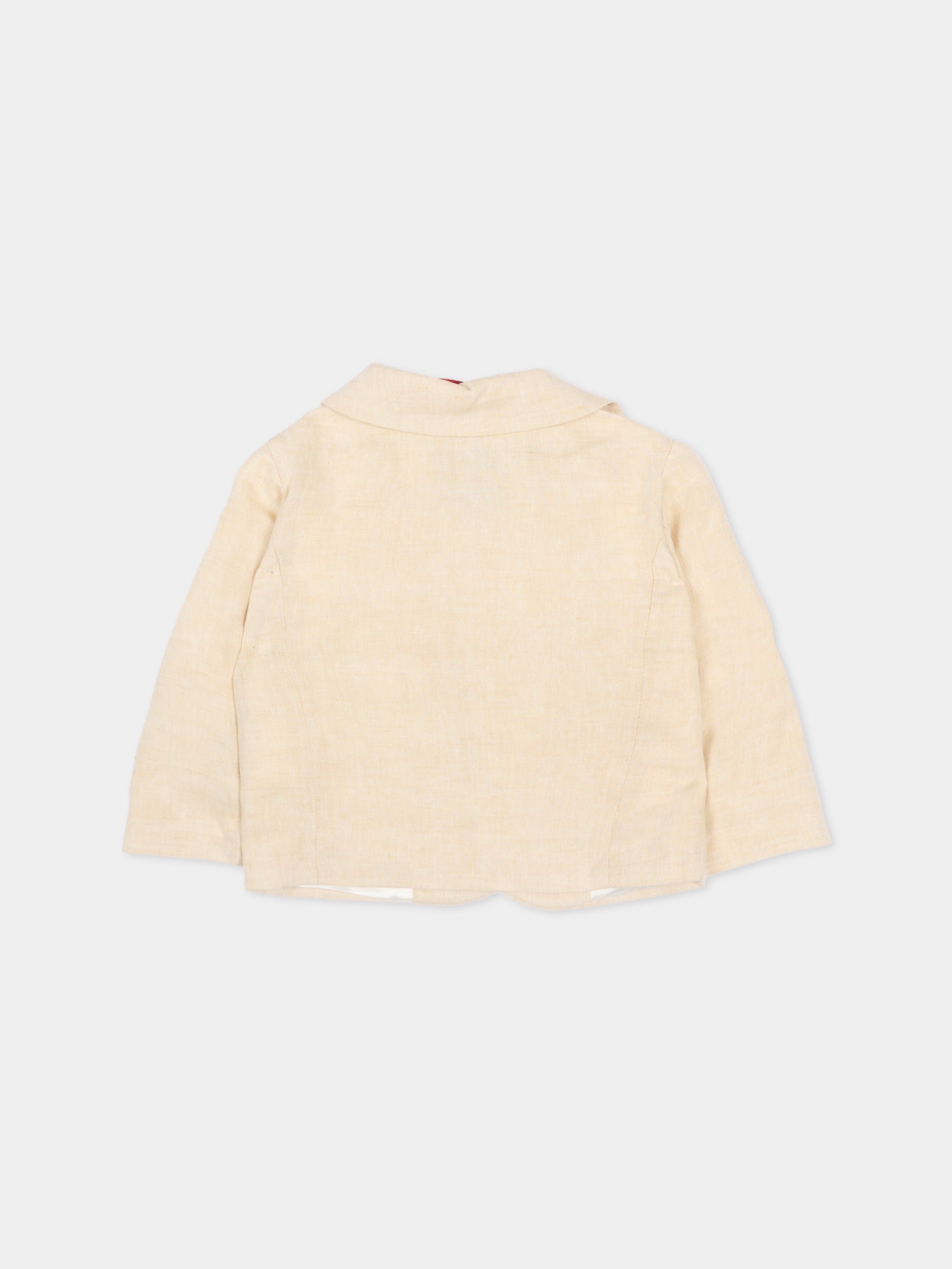 Giacca beige Fay Kids in misto lino dall’aspetto naturale, interamente foderata, proposta in una linea essenziale pensata per il neonato. Il modello presenta rever classici, chiusura frontale a due bottoni, taschino a filetto sul petto che richiama il guardaroba formale degli adulti. Le due tasche applicate completano il davanti, una delle quali personalizzata dal logo Fay ricamato tono su tono. Il fondo leggermente arrotondato e le spalle morbide creano un profilo ordinato e confortevole.