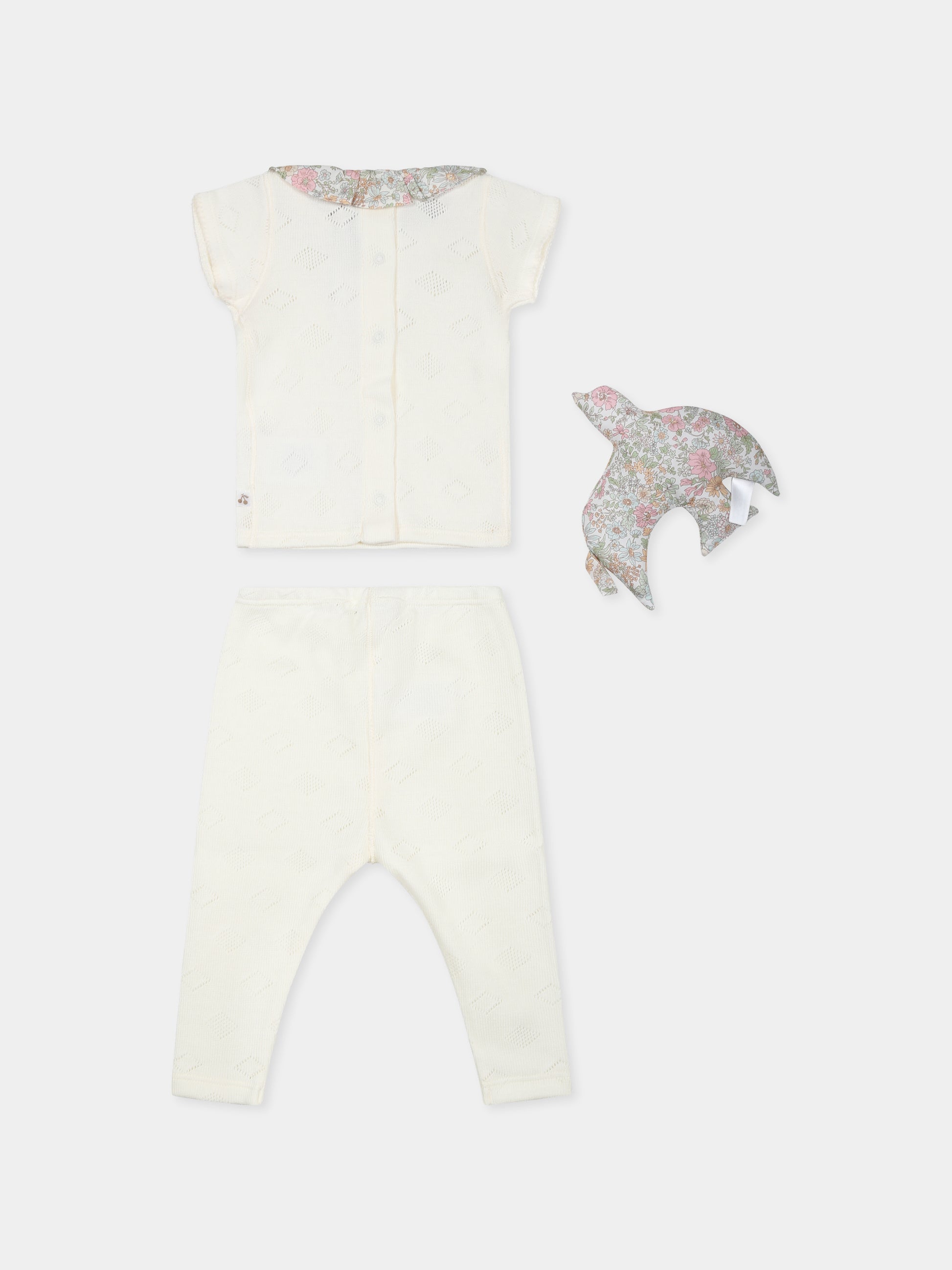 Colore: Avorio Descrizione: Completo nascita avorio in cotone composto da maglia, pantaloni e peluche. Maglia a maniche corte, con colletto in tessuto liberty con stampa floreale e bottoni automatici sul retro. Pantaloni con vita elasticizzata. Peluche imbottito in tessuto liberty. Dettagli: 100% Cotone. Lavare a 30°C.